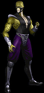 BIO After Shao Kahn's defeat, Reptile finds himself a fugitive in the realm of Edenia. But when Shinnok takes over the realm, Reptile is quick to join his forces. He holds allegiance to those with great power and his role as a cold-blooded killer earns him Shinnok's trust and a place in his army of darkness. MOVES Weapon : Battle Axe Ready Weapon : B, B, HK Acid Spit : QCF, HP Invisibility : LK + BL Elbow Dash : B, F, LP Super Kraw : F, F, B, LP Fatality #1 : (Hold HP, LP, HK, LK) UP (Close) (He jumps on top of you and chews your face off. Then you fall to the ground and the camera zooms in on the eaten face. It's sick!) Fatality #2 : U, D, D, D, HP (Just past sweep, can be done while invisible) (He spits acid on you 3 time and carrodes your skin away) Prison Stage Fatality : D, F, F, LP (Close) Goro's Lair Fatality : D, D, F, HK (Close) Kombo #1-- Jump in deep, tap HK, B, F+LK --18% damage Kombo #2-- Tap HK, HK, B, F+LK --25% damage ENDING Reptile is talking with Quan Chi and is telling him how he had served Shinnok well and he wants to be sent back in time to before his race was wiped out by Kahn. Quan Chi then tells him that this is not a resonable request. Reptile continues saying it is what he deserves. Shinnok then appears and grabs Reptile by the neck. Reptile keeps saying he deserves it. Shinnok says he is not a god of promises and then kills Reptile.